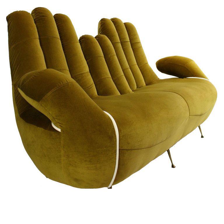 His favorite store item? “The hand couch, definitely,” Hawkins says. The furniture in question is a plush, low-seated, mustard-yellow couch in the shape of two cupped hands — with thumb armrests to match.