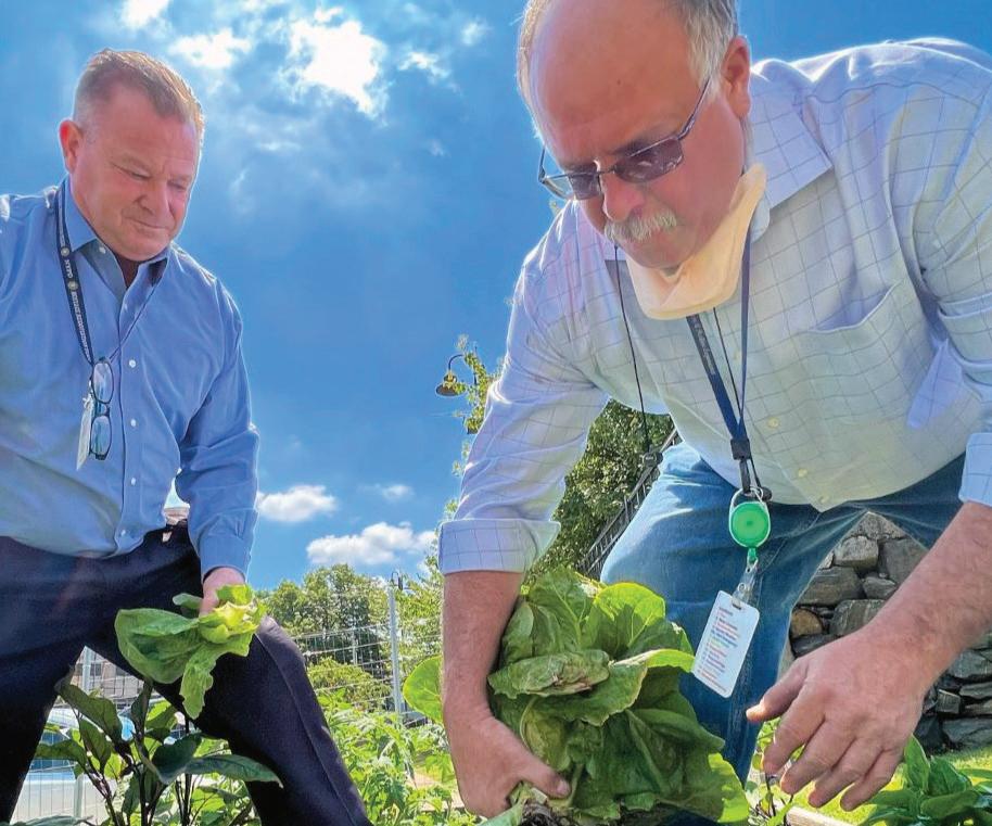 Huerta Comunitaria de St. John’s Riverside Hospital atendida por TIM HODGES (Presidente del Rotary Club de Yonkers), VPA de Soporte entre Centros y RICH LITSKY, Director Adjunto de la Planta de Operaciones.