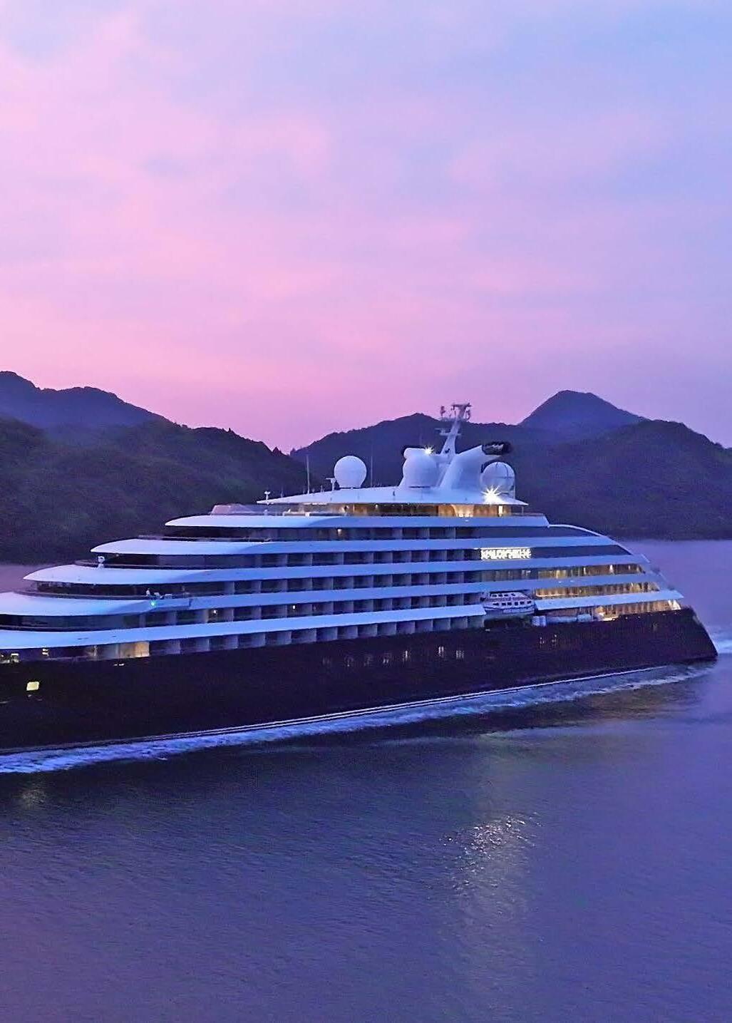 The Scenic Eclipse II is an ultraluxury discovery yacht featuring suites with private verandahs, multiple dining options, bars and lounges, a spa, a fitness centre, and even a helicopter and submarine for unique excursions.