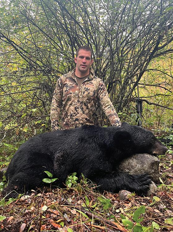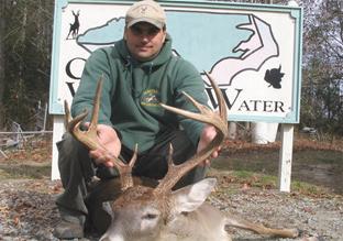 we would have liked. I quickly directed Chris to a small window on the edge of the planted spruce. It would be a 40-yard shot. We could now see his rack and it looked huge. Just as he entered the opening, I said to myself maybe out loud “It’s the Cross, the Cross Bull!” Then, I said to Chris, “When you are ready, if you have a good shot take him.”