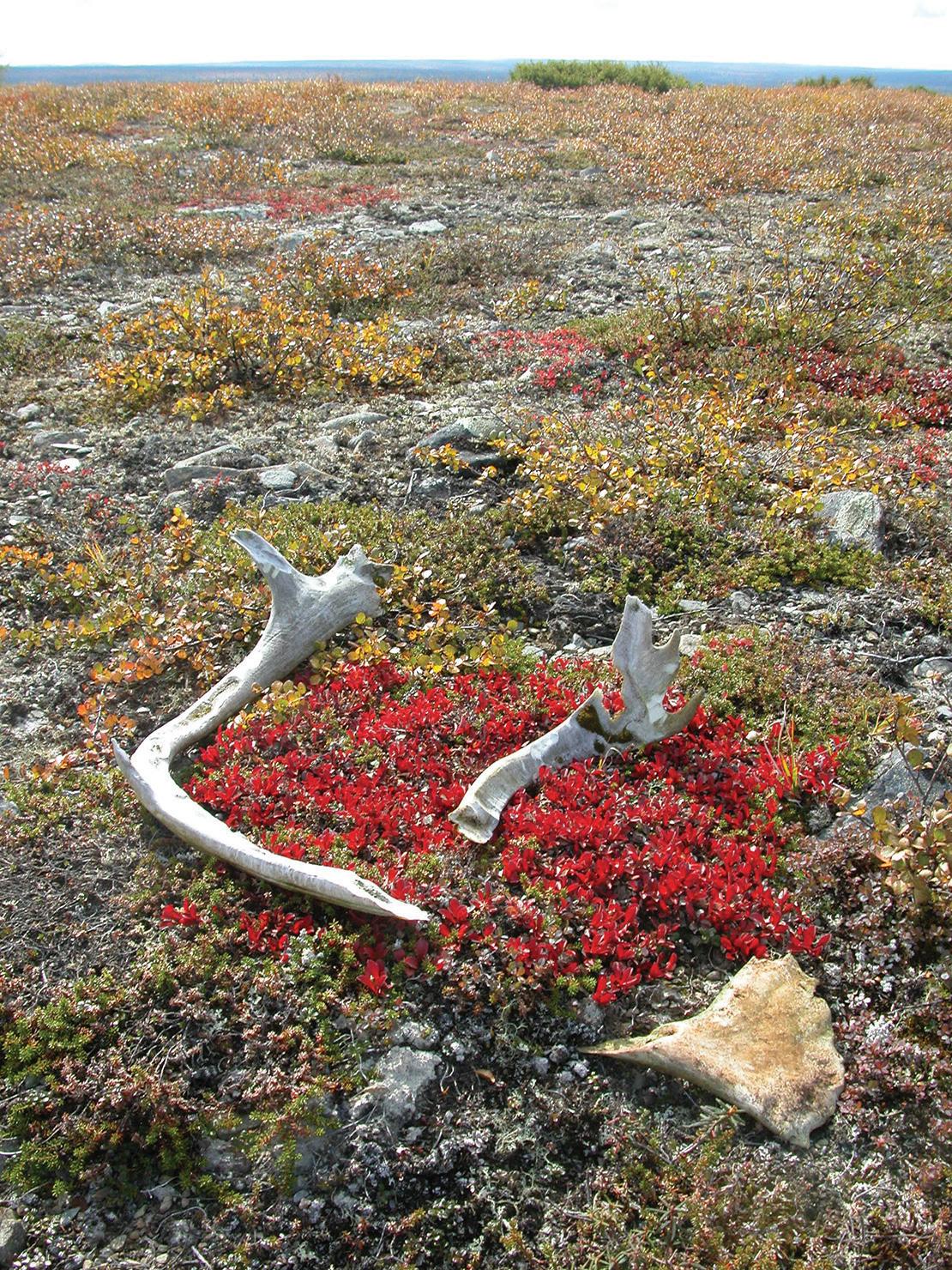 Just a few feet away the sun glints through a kaleidoscope of raindrops clinging to the skeleton of a gnarled black spruce. The tiny prisms shift from purple to green to orange, finer than any Tom Thompson oil painting. Further on down the ridge is a large canvas of mountain cranberry; blood-red splotches of crimson red straight from the tube dabbed on a bronze-green background. A snow-white ptarmigan feather waves in the breeze. The rusty-red foliage of bog laurel and dwarf birch match the burnished copper of freshly polished caribou antlers. Patches of cotton grass shake their shaggy heads in disbelief. Arctic foxes blink and stare. This exquisitely painted landscape is surely the craftwork of an unseen Creator. In September I dream of the tundra; free as the caribou trotting over the ridge with their heads held high under the arctic sun.