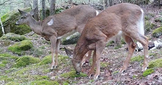 It was a calm morning with temps in the low 40’s. I happened to be walking down the narrow dirt road thinking about the Cross bull that lived in the area. We had located his sheds the prior winter and had three years of photographed history both by aerial and trail camera. This was on my mind as I did the moose walk down the road that was taught to me by my mentor, OMM team member and close friend who had recently passed, Guy Randlett. My thoughts were interrupted by the sound of a bull raking to my right in the planted spruce as he had heard me. His raking was his way of saying “stay away.” A little while later a cow bellowed. It was clear this was the situation we needed.