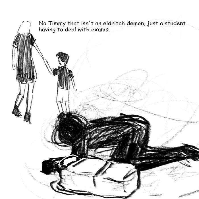 I close my eyes and imagine myself half an hour ago when she was still alive. I want to pretend that if I think hard enough, I’ll be able to bring myself back to that time and avoid this whole process. I don’t know what I want to do with her. She’s gone, but her body speaks for itself; it’s clear what I’ve done, and there’s no use thinking about her when I’m left to handle whatever comes after If only I had kept my temper in check.