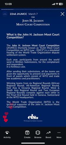 ELSA's members are internationally-minded individuals who have an interest in foreign legal systems and practices Through our activities, such as seminars, conferences, law schools, moot court competitions, legal writing, legal research, and traineeships our members acquire a broader cultural understanding and legal expertise.