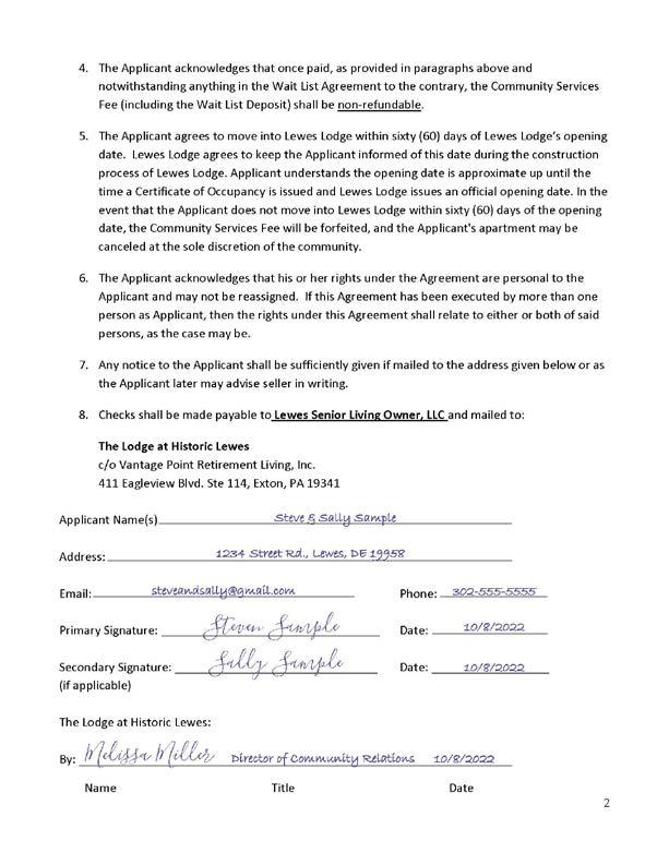 The Lewes Lodge team will begin to contact depositors by order of their deposit date to notify them of their awarded apartment. If you choose to select that apartment we’ll coordinate a time for you to sign your membership agreement and submit the remainder of the one-time community fee for your apartment (1 month’s rent less your $2,500 deposit). This may take several weeks, depending on response – but we promise we’ll be in touch as soon as possible!