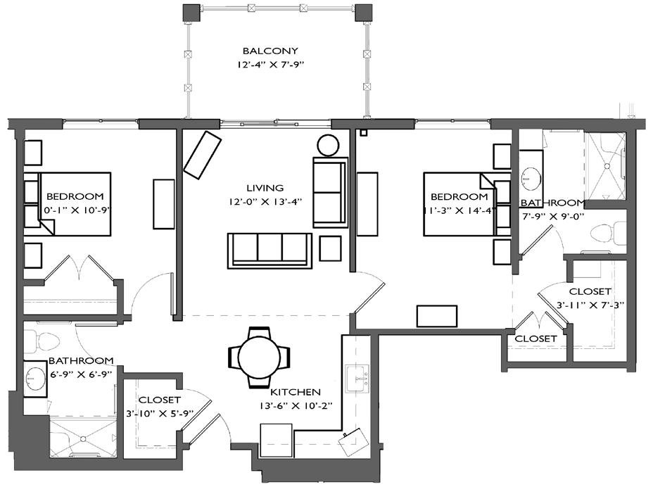 Bedroom Type 1A – 968ft² Apartments: 1005, 1027, 2005, 2027, 3005, 3027