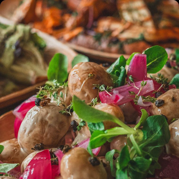 • Knolselderij roti, gemarineerde paddenstoelen, gebrande prei, kombu beurre blanc, prei-olie en gerookte amandel (V)