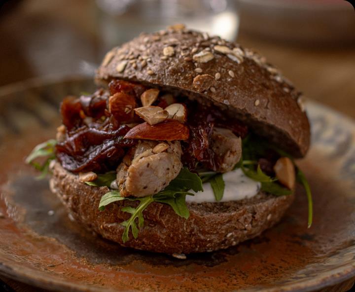 cajunkruiden, pesto, citroenmayonaise, rucola en rode-uipickle