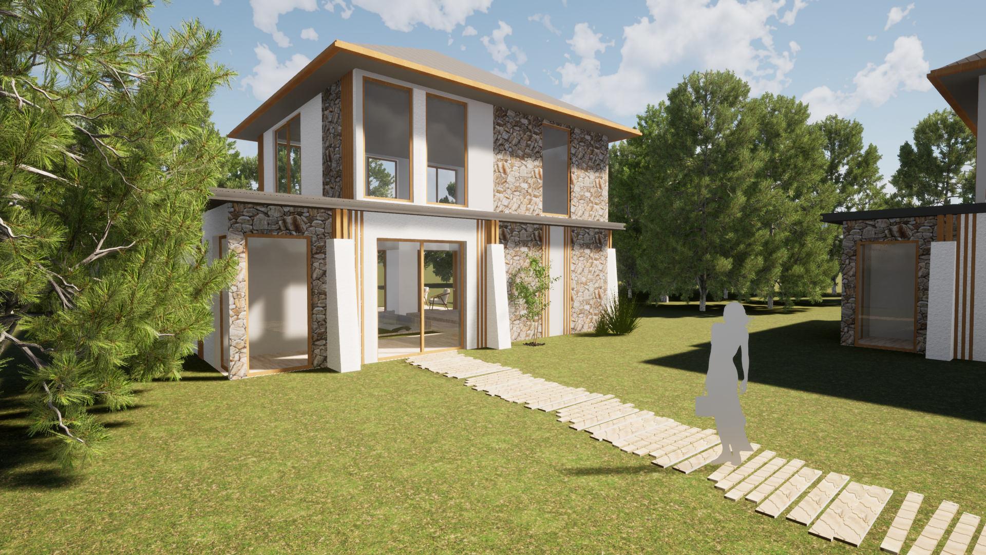 Establos que se incorporan al entorno gracias a sus techos inclinados y materiales naturales utilizados en el diseño, cabe mencionar que se le incorpora área de presentacion de caballos como parte de las actividades de la granja.
