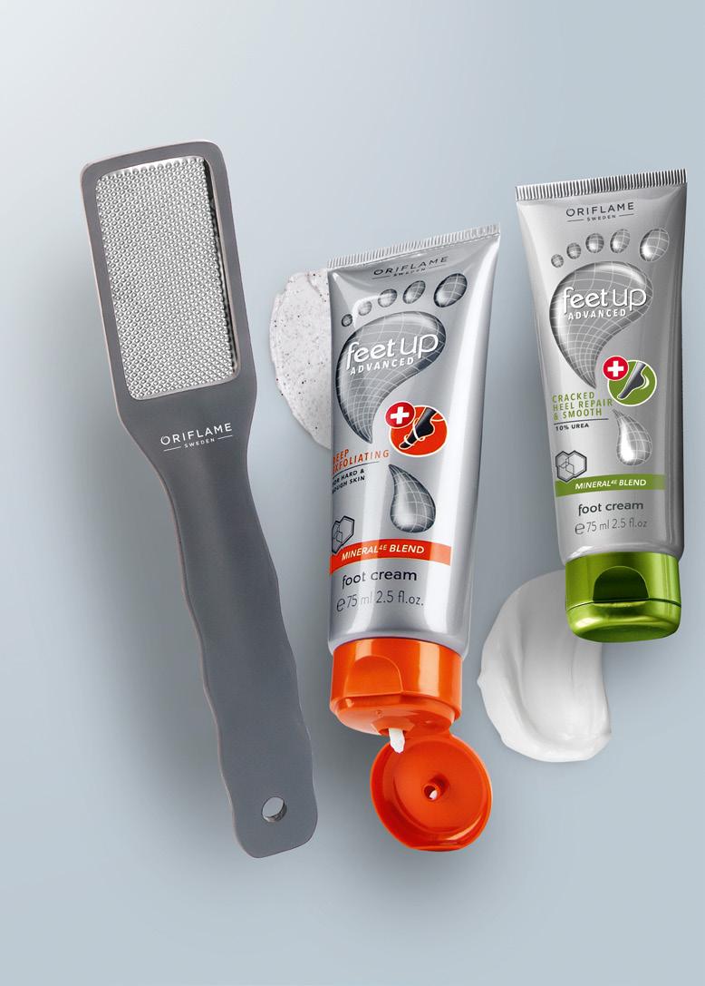 Vaš nepogrešljiv komplet za pedikuro. Večnamenski pripomoček nežno zgladi hrapavo kožo. Krema ohranja vaša stopala mehka in osvežena. Sprej pa pomaga pri hlajenju – uporabite ga na stopalih ali v čevljih!