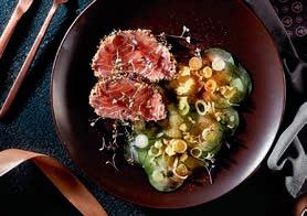 Poskusite ga ob tuninem fi leju s sezamovo skorjico in kumarično solato. Sadne note vina se lepo ujemajo s tuno in marinado, mehkoba omili sezam, svežina pa povzdigne tuno in ingver, kar jedi doda gurmansko piko na i.