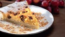 4 Pogačo postavimo nazaj v pečico, da se nekoliko popeče. Zatem potresemo po nadevu prebrane in oprane rozine, grobo narezane orehe ali olupljene in na polovico prerezane mandlje.