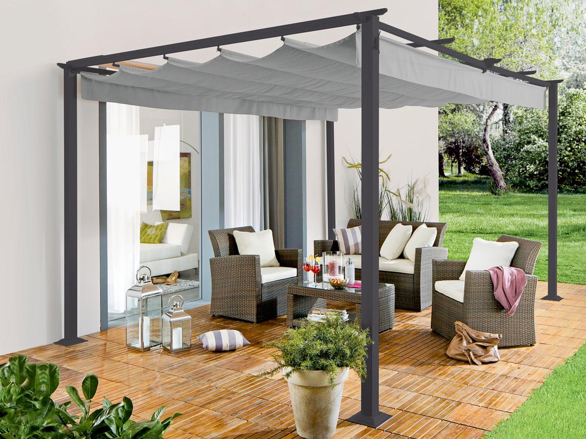 Paviljon 'Jakarta II' prašno barvano jekleno ogrodje, premična streha iz poliestra 260 g / m², premikanje strehe na poteg z vrvico, temno siv d