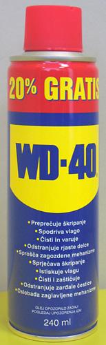 Sprej 'WD - 40' 240 ml, preprečuje škripanje, maže kovinske spoje, odstranjuje staro maščobo, lepilo in podobne ostanke, ščiti kovine pred rjo in korozijo 4,95 20907677