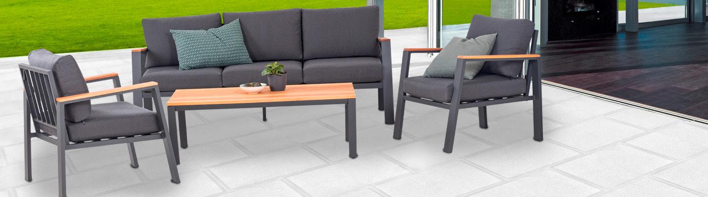 sestavljena iz troseda d 192 x š 86 x v 67 cm, dveh naslanjačev d 90 x š 86 x v 67 cm in mize d 110 x š 60 x v 33 cm, aluminijasto ogrodje / mizna plošča in nasloni za roke iz FSC evkaliptusovega lesa, vklj. blazine za sedeže in naslone, antracit 28152417