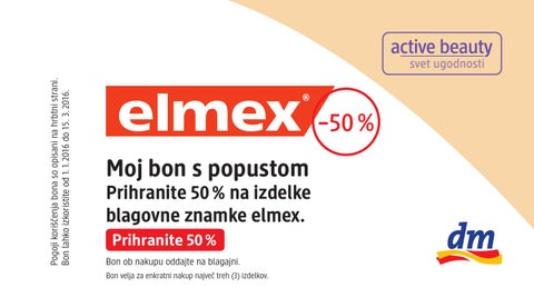 Prihranite 50 % na izdelke blagovne znamke elmex. Prihranite 50 % Bon ob nakupu oddajte na blagajni. Bon velja za enkratni nakup največ treh (3) izdelkov.