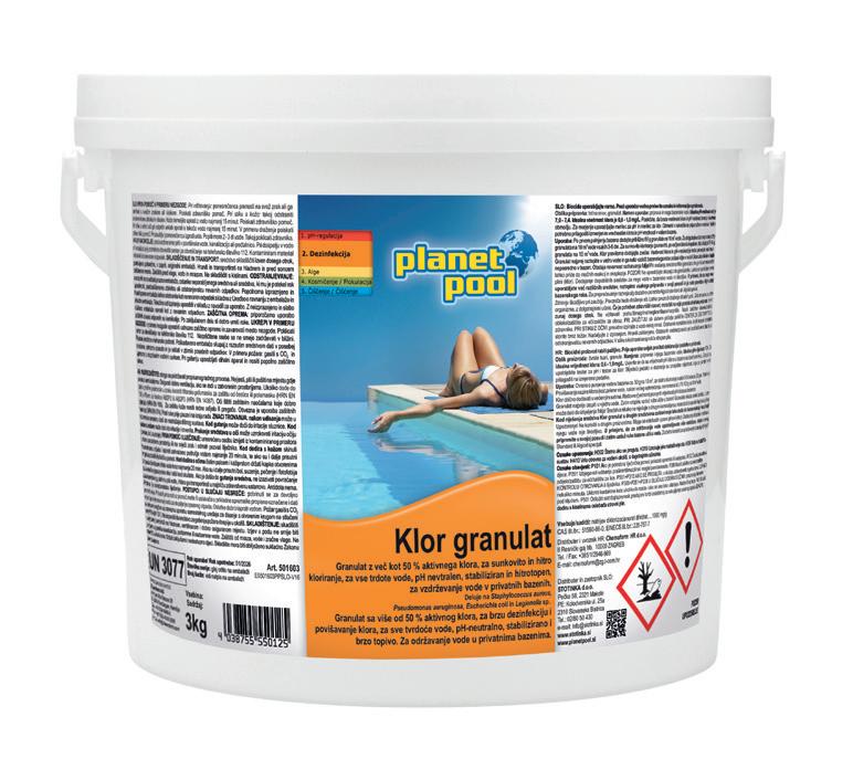 HIDROTOPEN GRANULAT PLANET POOL Vsebina 3 kg, klor granulat je sredstvo z več kot 50 % aktivnega klora, ki ga uporabljamo za prvo, sunkovito in hitro kloriranje.