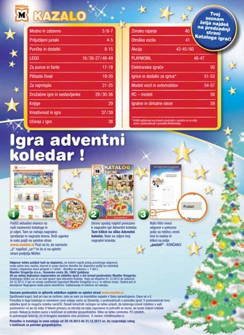 Seznam poslovalnic in njihovih oddelkov najdete na spletni strani www.mueller.si Spoštovani kupci, tudi pri nas se motimo, zato se vam za morebitne napake v tisku opravičujemo. Cene so v €. Ponudba iz tega kataloga in navedene cene veljajo samo za Slovenijo, v poslovalnicah s ponudbo igrač. V poslovalnicah icah brez oddelka Igrač je mogoče izdelke naročiti. Zaradi tehničnih razlogov se lahko pripeti, da katerega izmed izdelkov v vaši poslovalnici ne bo na voljo. V takem primeru se obrnite na naše zaposlene in potrudili se bomo, da boste željeni izdelek elek prejeli. Nakup je možen samo v količinah za potrebe gospodinjstva. Slike so lahko simbolne. Pri izdelkih, ki potrebujejo baterije, če ni drugače navedeno niso priložene. E-naslov: info@mueller.si Ponudba iz kataloga in cene veljajo od 28.10.2013 do 31.12.2013 oz. do razprodaje zalog v količinah za potrebe gospodinjstva.
