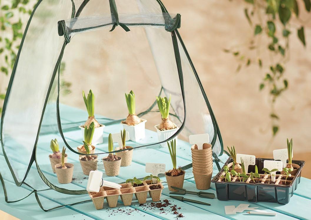 komplet vsebuje: lončke, orodje, pladenj s pokrovom in etikete za rastline, mere: 20,5 x 24 x 7 cm