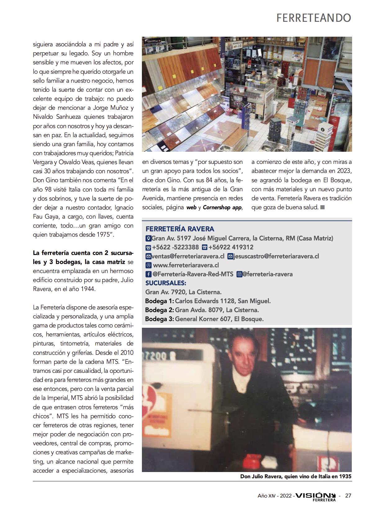De gran tradición y renombre, “Ferretería J. Ravera desde 1938, haciendo historia en la Gran Avenida”, fundada por don Julio Ravera, quien llegó de Italia en el año 1935, y vigente hasta hoy, bajo la dirección de Juan Ravera, conoci do como Gino, y sus hijas, quienes lo acompañan laboralmente en todas las funciones de la empresa: Lorena, Pao