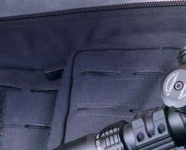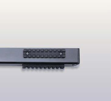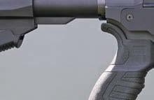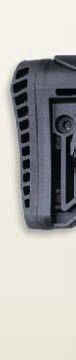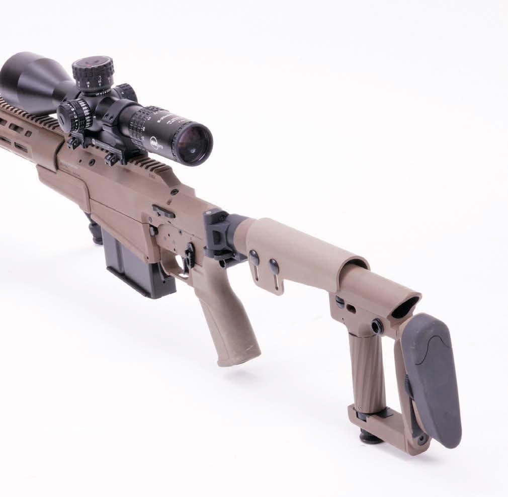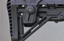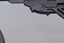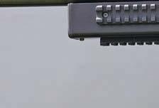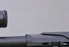 Marktes an Nachrüstteilen aus dem Vollen schöpfen kann. Die serienmäßige, in fünf Stufen längenverstellbare Schulterstütze erlaubt eine LOP (Length of Pull)-Variation im Abstand zwischen Kappe und Abzugszunge von 280 auf bis zu 360 mm. Nach Lösen der Kunststoffmuttern auf beiden Seiten lässt sich die Wangenau age um rund 40 mm in der Höhe verstellen. Am kantigen Vorderschaft be nden sich auf beiden Seiten ächen sowie an der Unterseite 10 cm lange Picatinny-Montageschienen, die beispielsweise für die Anbringung eines Zweibeines genutzt werden können. Im Leichtmetall-Systemkasten des modular
