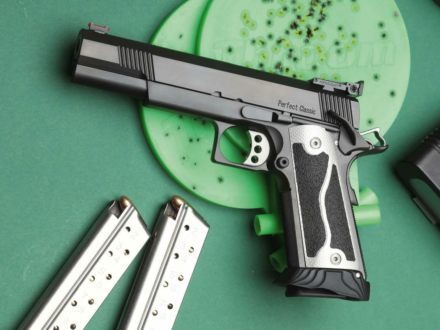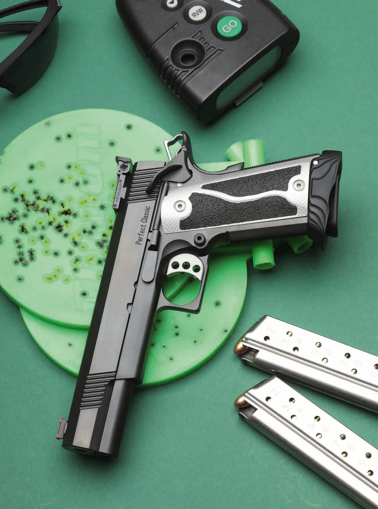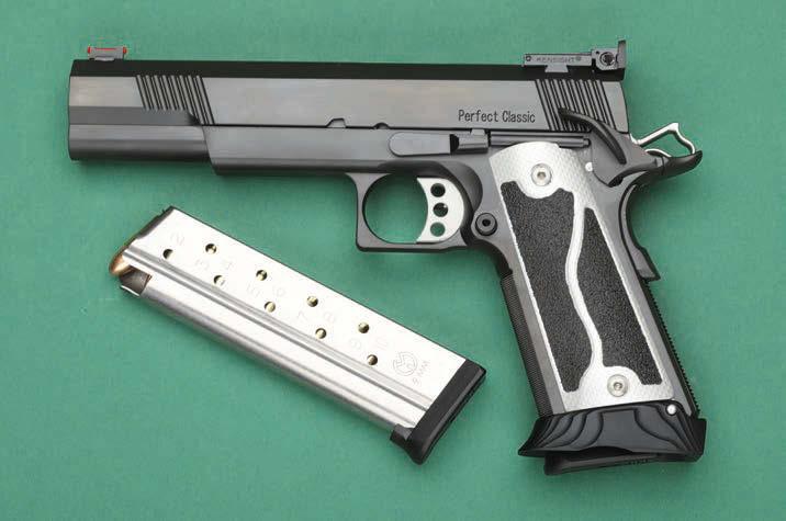 Vor rund einer Dekade hat der Weltverband International Practical Shooting Confederation (IPSC) die Classic Division eingeführt. Als Ersatz für die sehr spezielle Modi ed Division, in der vorwiegend 1911 High-Capacity-Pistolen in .40 S&W mit Kompensator und Leuchtpunktvisier, die in einen Kasten mit den Maßen 225x150x45 mm (L/B/H) passen mussten, beheimatet waren, sollte sie für mehr Zulauf im dynamischen Schießsport sorgen. Auch wenn dieses Konzept angesichts der Starterzahlen bislang nicht ganz aufging, ist die Classic Division für Anhänger der traditionsreichen 1911 doch IPSC in Reinkultur. Hier wird das Credo „zurück zu den Wurzeln“ auf dem Schießstand im Feuer gelebt, denn man ghtet prinzipiell mit einer Ausrüstung und vielen Magazinen am Mann um Punkte, mit der vor über 40 Jahren alles begann. Doch wieviel „Classic“ heutzutage im Detail noch in der Classic Division steckt, darüber lässt sich tref ich streiten. Würde man sich an die Originalkaliber halten, dürften streng genommen nur die teuren Major-Kaliber wie .45 Auto oder .38 Super Auto mitspielen. Dahingehend hat der Weltdachverband gut daran getan, auch die kostengünstige 9 mm Luger als Minor-Kaliber aufzunehmen. Auch wenn man die Länge des Schließfedergehäuses des Griffstücks („Dust Cover“) begrenzt hat, ist es oftmals nicht bei der schlanken Originalform von einst geblieben, denn massivere Griffstücke sollen den Hochschlag physikalisch begrenzen. Auch bei der Lau änge ist meist nicht mehr die Originallänge von 5“/127 mm geblieben und Bull-Barrel-Läufe ohne traditionelle Lauf-