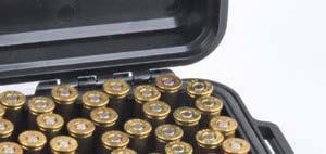 Auf dem Weg zum Schießstand wird die Waffe ordentlich verschlossen in der Schießtasche transportiert. Die Munition befindet sich üblicherweise in Reih und Glied in den fabrikmäßigen Verpackungen oder Kunststoffboxen. Wer als Revolverschütze häufig Speedloader verwendet, greift gerne auf die Kisten beziehungsweise Ladebretter von Safariland zurück. Hier kann man die Patronen artgerecht für die schnelle Aufnahme in den Speedloadern vorsortieren. Der Nachteil dieser Ladebretter ist die Unhandlichkeit. Neben der Schießtasche trägt man in aller Regel noch die sperrige Munitionskiste zum Stand. Abhilfe sollen hier die Munitionsboxen der Firma Piffalapuff schaffen. Hinter dem klangvollen Namen steht Werner Schatz, der sich als langjähriger