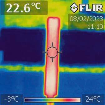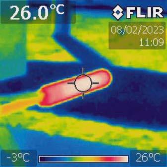 Am Testtag herrschten um die 0°C Lufttemperatur, was in einem Bereich angesiedelt ist, der auch an Treibjagdtagen herrschen kann. Begonnen wurde mit dem B&T Dämpfer aus dem Behördensegment. Zum Einsatz kam eine Laborierung mit einem 168 grs.-Geschoss, das auf eine gemessene Mündungsenergie von 3.060 Joule kommt. Bei der Versuchsreihe erkennt man recht deutlich, dass die Schussbelastung dem B&T-Dämpfer nahezu nichts anhaben kann. Selbst nach 5 Schuss in 5 Minuten (Bild 6) hat der Dämpfer mit 26°C Temperatur noch nicht mal Körperwärme erreicht. Ebenso kühlt der Schalldämpfer konstruktionsbedingt schnell wieder ab, sodass die Ober ächentemperatur schon nach einer weiteren Minute nur noch 22,6°C beträgt (Bild 7).