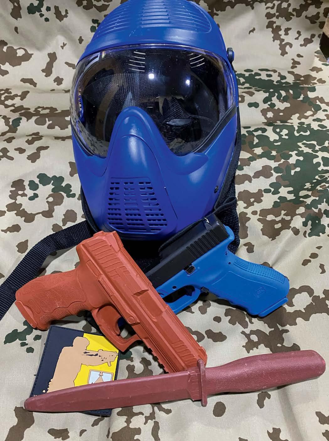 und dem emotionalen „ Wollen “ des Lerninhalts. Verletzungen aber gefährden den Ausbildungserfolg. Zur Ausbildung der Selbstverteidigung mit Hand und Fuß, Stock und Messer reichen Schutzkleidung und Gummiwaffen, wie „ Red Knife “ und „ Red Gun “ auf dem Aufmacher. Realitätsnah heißt hier, die enge Balance zwischen blauen Flecken und dem Ausfall des Teilnehmers zu wahren. Der Unfall schläft nicht, und Menschen handeln auch unter gewolltem Stress emotional und unvernünftig. Sie sollen lernen, damit umzugehen. Die Schießausbildung steigert das Gefahrenpotenzial. „ Einsatz “ heißt immer Bewegen, Kommunizieren und Anwenden je nach Lage – und mittendrin der Gebrauch tödlicher Hilfsmittel wie Gewehr und Pistole. Schon Übungen im überschlagenden Vorgehen auf der Schießbahn bergen Gefahren. Diese steigern sich in Gebäuden und Rundumfeuer (180°). Jäger kennen es: Bei Bewegungsjagden können neben Wild noch Treiber, Waidgenossen, aber auch Passanten und Hunde auftauchen.