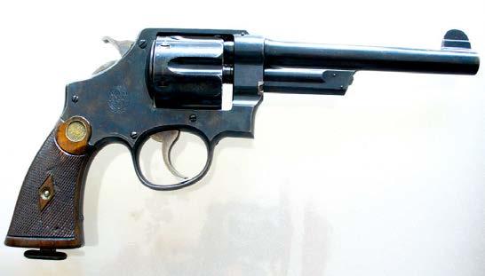 Smith & Wesson Hand Ejector Mark II, Kaliber: .455 Webley, Kapazität: 6 Patronen, Lauflänge: 6,5 Zoll. Finish: poliert und brüniert, Hahn und Abzug buntgehärtet. Gecheckerte Holzgriffschalen mit goldfarbenem S & W-Medaillon.