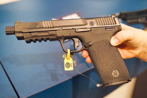 Polymer-Griffstück fasst Magazine mit 22 Patronen. Die Abzugseinheit mit acher Abzugszunge samt integriertem Sicherungselement besitzt ein internes Schlagstück und nicht das klassische Schlagbolzenschloss von S & Ws M & PPistolenbaureihe. Der Verschluss mit