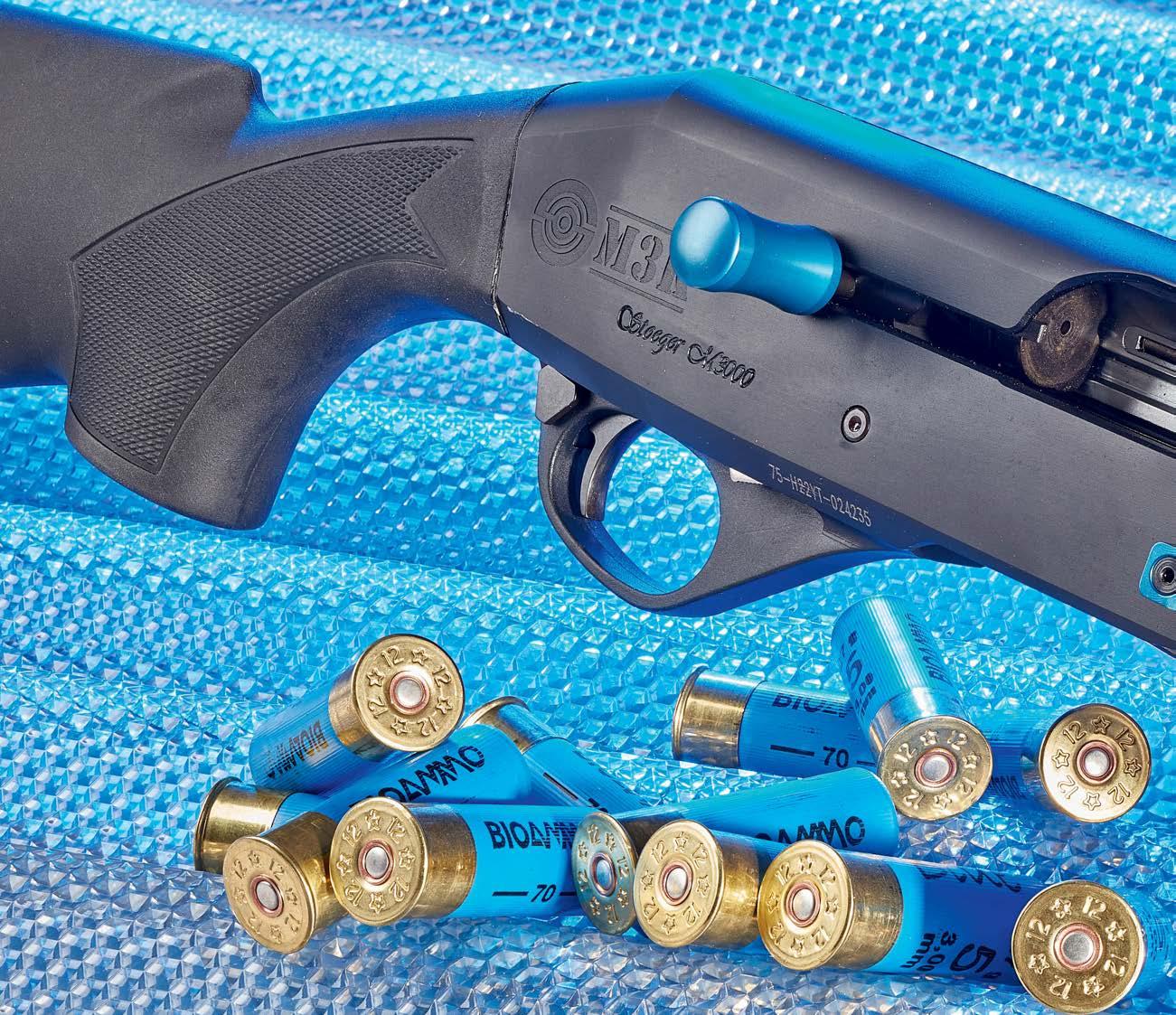 Negatives auf – sehr gut. Heute bei Selbstladefl inten fast schon selbstverständlich: Die M3000 M3K hat einen Stahlschrot-Beschuss und ist für das starke Kaliber 12/76 ausgelegt. Das Leichtmetall-Systemgehäuse ist an der Oberseite mit mehreren Bohrungen zum Anbringen einer Montageschiene versehen. An der Unterseite fällt die großzügig erweiterte Ladeöffnung auf. Das sogenannte „Easy Load“-Gehäuse soll das Laden bzw. Nachladen deutlich erleichtern. Dazu später mehr.