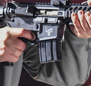 mers zwar nicht deutlich, aber noch deniert wahrnehmbar sein soll. Die Handlage unterstützt oben am Griff ein weit ausladender Sporn an der Handballensicherung, unten der voluminöse Magazintrichter. Die Flügelsicherung ist