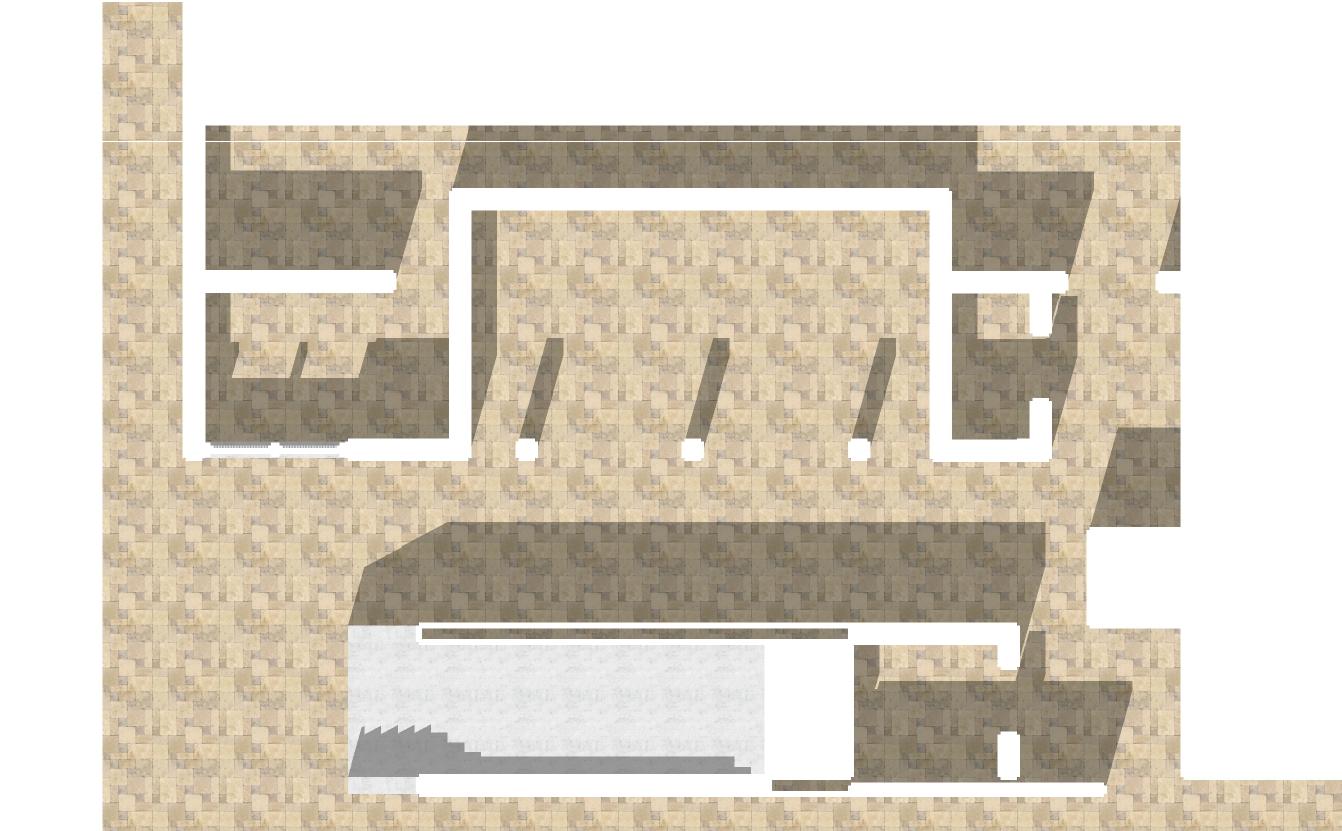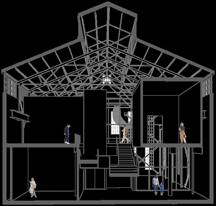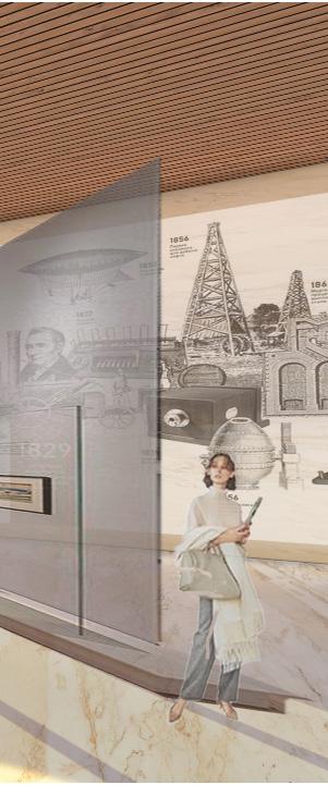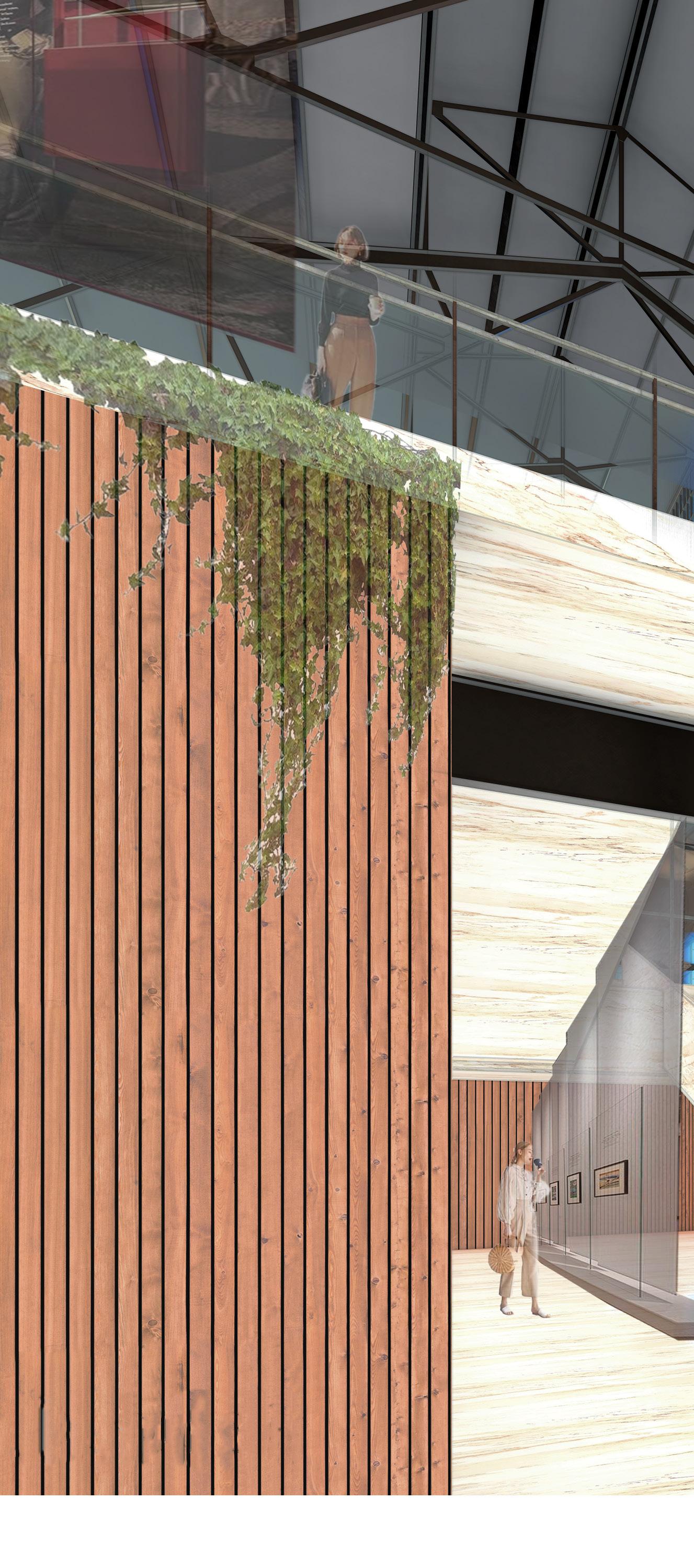 There are 3 zones: the extension of the main gallery that represents the clean slate of the present and future, the intermediary space that is open for gathering and flexibility, and the restoration shop that represents and preserves the past. These zones are defined by atmospheric contrasts and shifts in materiality, as well as the main ship-frame artifact being split into three parts to act as a threshold into each “stage of evolution.”