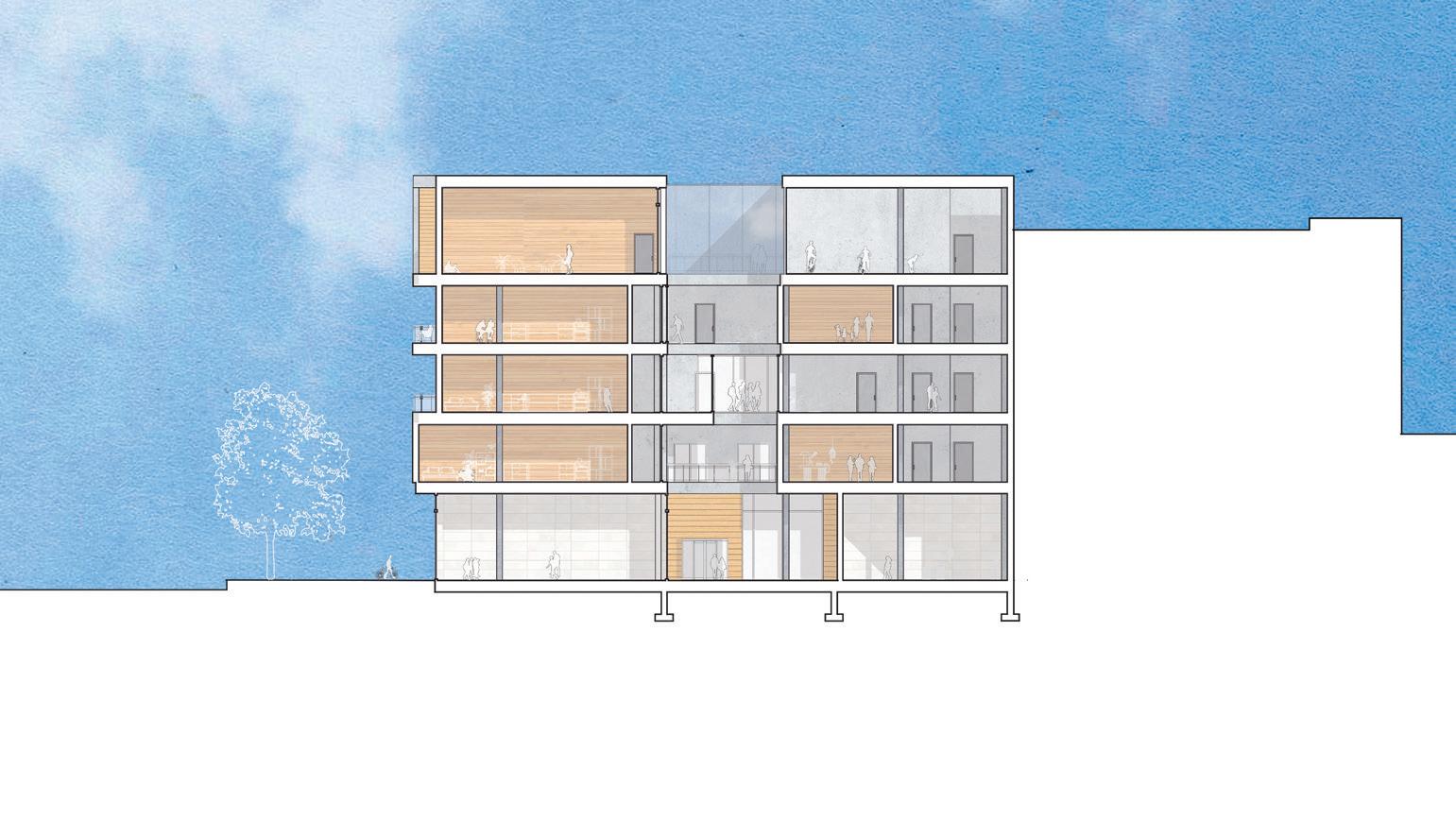The central corridor is home to residents and other lively elements alike such as light and wind. The bridges help to filter those elements, adding atmospheric texture. The dynamic paths lead the viewers eyes up as if the sky is the ceiling. Thus, this lively mixed-use hub provides a sense of security while being open to the outside world.