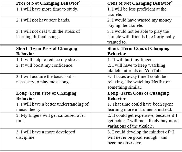 The procedure was that any time (with a minimum of 10 minutes) associated with ukulele playing was rewarded with the same amount of time watching preferable content on YouTube, Netflix, and other streaming services. In many cases to initiate playing, I placed the ukulele in the same position I put my laptop in when I get home. This way, the visual indication of the ukulele functioned as a cue to start playing. A pros and cons list was also created prior to performing the experiment (as demonstrated by fig. 2), including predictions for the experiment. Predictions consisted of decreased stress levels and higher self-esteem for short-term benefits, and hurt fingers and less time on other activities for short-term consequences.