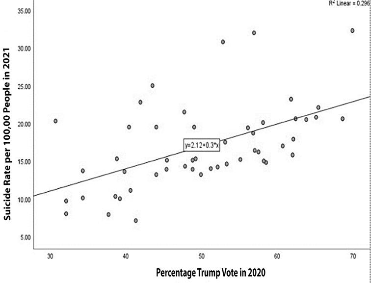 and statistically significant relationship between the percentage of the vote for Trump in 2020 and the suicide rate per 100,000 in 2021. An r-squared value of 0.296 indicates that the Trump vote in 2020 explains 29.6 percent variance in the dependent variable of the suicide rate per 100,000 people in 2021. The regression line is equal to y=2.12+0.3*x. The y-intercept explains that if there were no votes for Trump, the suicide rate would decrease by 2.12. The slope of the regression line explains that for every percentage point increase in the Trump vote, the suicide rate increases by 0.3.