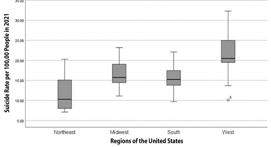 There are nine independent variables in this study that have been observed in order to evaluate their effect on the suicide rate before and after the pandemic throughout the fifty states. The percentage of the population with a bachelor’s degree and the percentage of the population aged 25 to 64 can be found on the “Annie E. Casey Foundation Data Center” website. The percentage of Trump votes in 2020 can be found on the “Cable News Network” (CNN) website. The amount of state mental health agency expenditures per capita can be found on the “American Addiction Center’s Rehab” website. The percentage of the population unemployed at the height of the pandemic can be found on the United States Bureau of Labor Statistics website. The crime rate per 100,000 people can be found on the “Statista” website. The level of gun restrictions by state can be found in the “SPSS Statistics Data Set” on States. The regions of the United States can be found on the “Centers for Disease Control and Prevention” website. The population density by state can be found on the “United States Census Bureau” website.