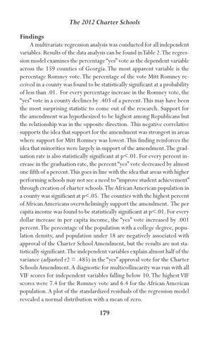 Findings A multivariate regression analysis was conducted for all independent variables. Results of the data analysis can be found in Table 2.The regression model examines the percentage “yes” vote as the dependent variable across the 159 counties of Georgia. The most apparent variable is the percentage Romney vote. The percentage of the vote Mitt Romney received in a county was found to be statistically significant at a probability of less than .01. For every percentage increase in the Romney vote, the “yes” vote in a county declines by .403 of a percent. This may have been the most surprising statistic to come out of the research. Support for the amendment was hypothesized to be highest among Republicans but the relationship was in the opposite direction. This negative correlative supports the idea that support for the amendment was strongest in areas where support for Mitt Romney was lowest. This finding reinforces the idea that minorities were largely in support of the amendment.The graduation rate is also statistically significant at p<.01. For every percent increase in the graduation rate, the percent “yes” vote decreased by almost one fifth of a percent.This goes in line with the idea that areas with higher performing schools may not see a need to “improve student achievement” through creation of charter schools. The African American population in a county was significant at p<.05. The counties with the highest percent of African Americans overwhelmingly support the amendment. The per capita income was found to be statistically significant at p<.01. For every dollar increase in per capita income, the “yes” vote increased by .001 percent. The percentage of the population with a college degree, population density, and population under 18 are negatively associated with approval of the Charter School Amendment, but the results are not statistically significant.The independent variables explain almost half of the variance (adjusted r2 = .485) in the “yes” approval vote for the Charter Schools Amendment. A diagnostic for multicollinearity was run with all VIF scores for independent variables falling below 10. The highest VIF scores were 7.4 for the Romney vote and 6.4 for the African American population. A plot of the standardized residuals of the regression model revealed a normal distribution with a mean of zero.