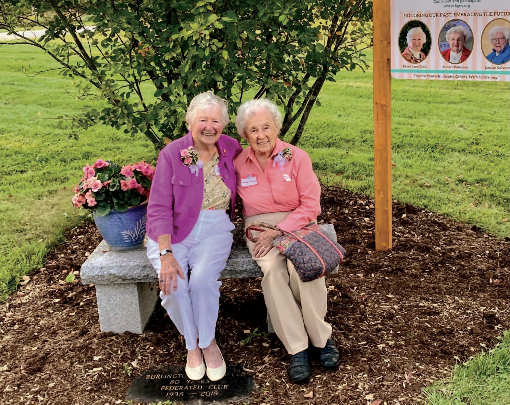 From left, Mary Jane Cain and Hester Paterson sit on the new memorial bench in South Burlington’s Vermont Garden Park commemorating the Burlington Garden Club.