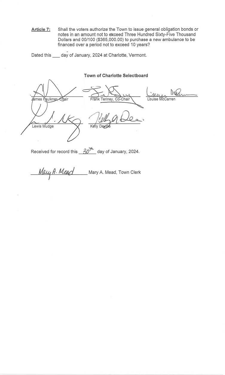 Residents will also be asked to approve a bond vote for $365,000 for the replacement of the 2014 ambulance.