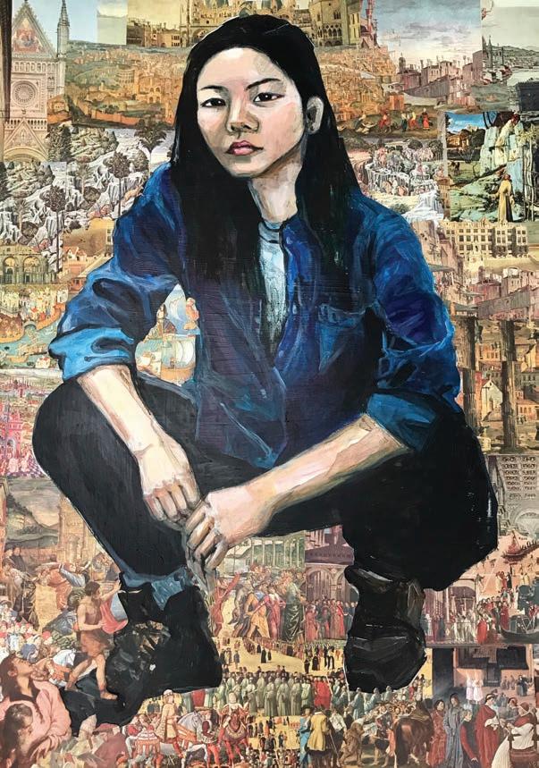 Right: Misoo Bang, “The Giant Asian Girl – Misoo 1,” 2018, collage and mixed media on paper, 36x48