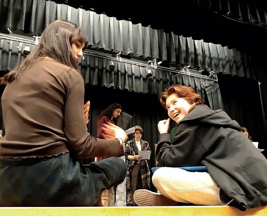 Rory McDermott discusses “Hamlet” with Addie Nevitt. In the background, actors Rusty Zia and Phoenix Caldwell rehearse lines.