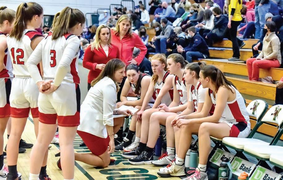 PHOTO BY AL FREY CVU head coach Ute Otley talks strategy during a timeout at the Redhawks’ semifinal game against the Mt. Mansfield Union Cougars at Patrick Gym in early 2022.