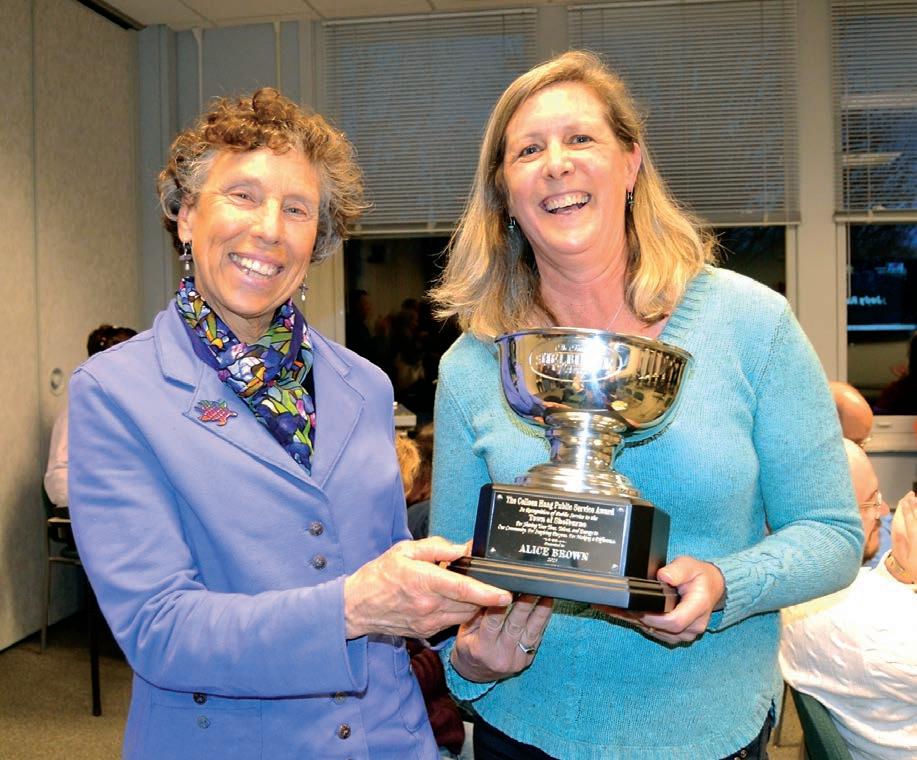 She is also this year’s recipient of Shelburne’s Colleen Haag award, which since 2016 has been awarded in recognition of a resident’s public service and community spirit and is named in honor of its first recipient and her 35 years as Shelburne’s town clerk. Last year’s recipient, Pam Brangan, presented Brown with her award at last week’s selectboard meeting.