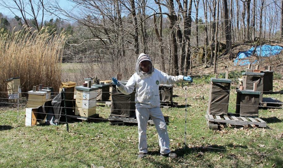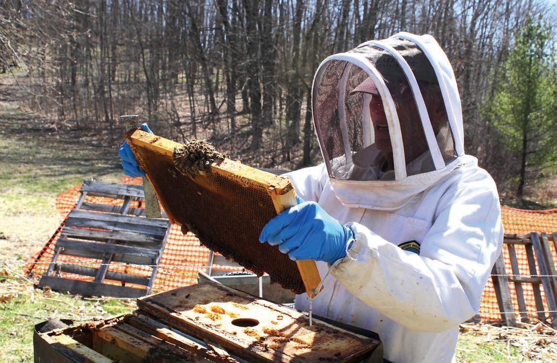 Outfitted in his white jacket and mesh hood, Ken Brown levered open the top of one of his hives last Thursday. The insects buzzed peacefully around his arms. Brown keeps bees in his backyard in Hinesburg, and he was checking to see how many of his bees had survived the winter.