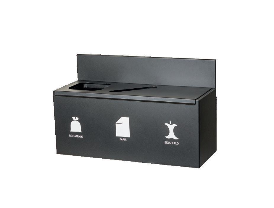 100 l affaldsbeholder, 3 rum. Mål: 38,5 x 115 x 80 cm. Varenr: 11000507 Affaldsbeholder