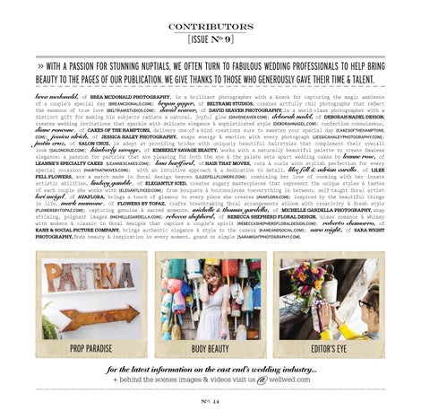 of BREA MCDONALD PHOTOGRAPHY, is a brilliant photographer with a knack for capturing the magic ambience of a couple’s special day [BREAMCDONALD.COM]; bryan yager, of BELTRAMI STUDIOS, creates artfully chic photographs that reflect the essence of true love [BELTRAMISTUDIOS.COM]; david seaver, of DAVID SEAVER PHOTOGRAPHY, is a world-class photographer with a distinct gift for making his subjects radiate a natural, joyful glow [DAVIDSEAVER.COM]; deborah nadel, of DEBORAH NADEL DESIGN, creates wedding invitations that sparkle with delicate elegance & sophisticated style [DEBORAHNADEL.COM]; confection connoisseur, diane roncone, of CAKES OF THE HAMPTONS, delivers one-of-a-kind creations sure to sweeten your special day [CAKESOFTHEHAMPTONS. COM]; jessica ulrich, of JESSICA HALEY PHOTOGRAPHY, snaps energy & emotion with every photograph [JESSICAHALEYPHOTOGRAPHY.COM]; justin cruz, of SALON CRUZ, is adept at providing brides with uniquely beautiful hairstyles that complement their overall look [SALONCRUZ.COM]; kimberly savage, of KIMBERLY SAVAGE BEAUTY, works with a naturally beautiful palette to create flawless elegance; a passion for pastries that are pleasing for both the eye & the palate sets apart wedding cakes by leanne rose, of LEANNE’S SPECIALTY CAKES [LEANNESCAKES.COM]; lena hartford, of HAIR THAT MOVES, cuts & curls with stylish perfection for every special occasion [HAIRTHATMOVES.COM]; with an intuitive approach & a dedication to detail, lilee fell & adrian carello, of LILEE FELL FLOWERS, are a match made in floral design heaven [LILEEFELLFLOWERS.COM]; combining her love of cooking with her innate artistic abilities, lindsey gamble, of ELEGANTLY ICED, creates sugary masterpieces that represent the unique styles & tastes of each couple she works with [ELEGANTLYICED.COM]; from bouquets & boutonnieres toeverything in between, self-taught floral artist lori meigel, of AVAFLORA, brings a touch of glamour to every piece she creates [AVAFLORA.COM]; inspired by the beautiful things in life, mark mansone, of FLOWERS BY TOPAZ, crafts breathtaking floral arrangements abloom with creativity & fresh style [FLOWERSBYTOPAZ.COM]; capturing genuine & sacred moments, michelle & thomas gardella, of MICHELLE GARDELLA PHOTOGRAPHY, snap striking, poignant images [MICHELLEGARDELLA.COM]; rebecca shepherd, of REBECCA SHEPHERD FLORAL DESIGN, mixes romance & whimsy with modern & classic in floral designs that capture a couple’s spirit [REBECCASHEPHERDFLORALDESIGN.COM]; roberto chamorro, of KANE & SOCIAL PICTURE COMPANY, brings authentic elegance & style to the camera [KANEANDSOCIAL.COM]; sara wight, of SARA WIGHT PHOTOGRAPHY, finds beauty & inspiration in every moment, grand or simple [SARAWIGHTPHOTOGRAPHY.COM].