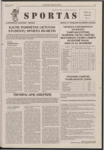 Česlovas KANDRATAVIČ1US, VU SSC docentas Nepriklausomos Lietuvos stu dentų sporto istorijoje galima iš skirti tris laikotarpius. Pirmuoju laikotarpiu (iki 1922 m. vasario 16 d.) studentai neturėjo sporto organizacijos, kuri rūpintųsi stu dentų sportu. 1992 m. lapkričio 14 d. Lietu vos universitete (Kaune) įkurta pirmoji sporto organizacija - spor to klubas „Achilas“. Jis tapo stu dentų sporto sąjūdžio pradininku Lietuvoje. Antruoju laikotarpiu (iki 1937 m. gegužės 20 d.) studentų sportui vadovavo Akademinis sporto klubas (AKS), bet jis nesu gebėjo įgyvendinti jam iškeltų už duočių, tad trečiuoju laikotarpiu (1937 m. gegužės 20 d.-1940 m. kovo 15 d.) jam vadovavo Akade minio jaunimo sporto sąjunga (AJSS), subūrusi Lietuvos aukštų jų mokyklų sportininkus. 1943 m., valdant naciams, užda rytos visos Lietuvos aukštojo moks lo įstaigos. 1944 metais Lietuvą an trą kartą okupavo Sovietų Sąjunga. Daug žmonių, ypač išsimokslinusių, meno, mokslo ir sporto žymūnų, buvo ištremti. Kūno kultūra irsportas buvo centralizuoti.