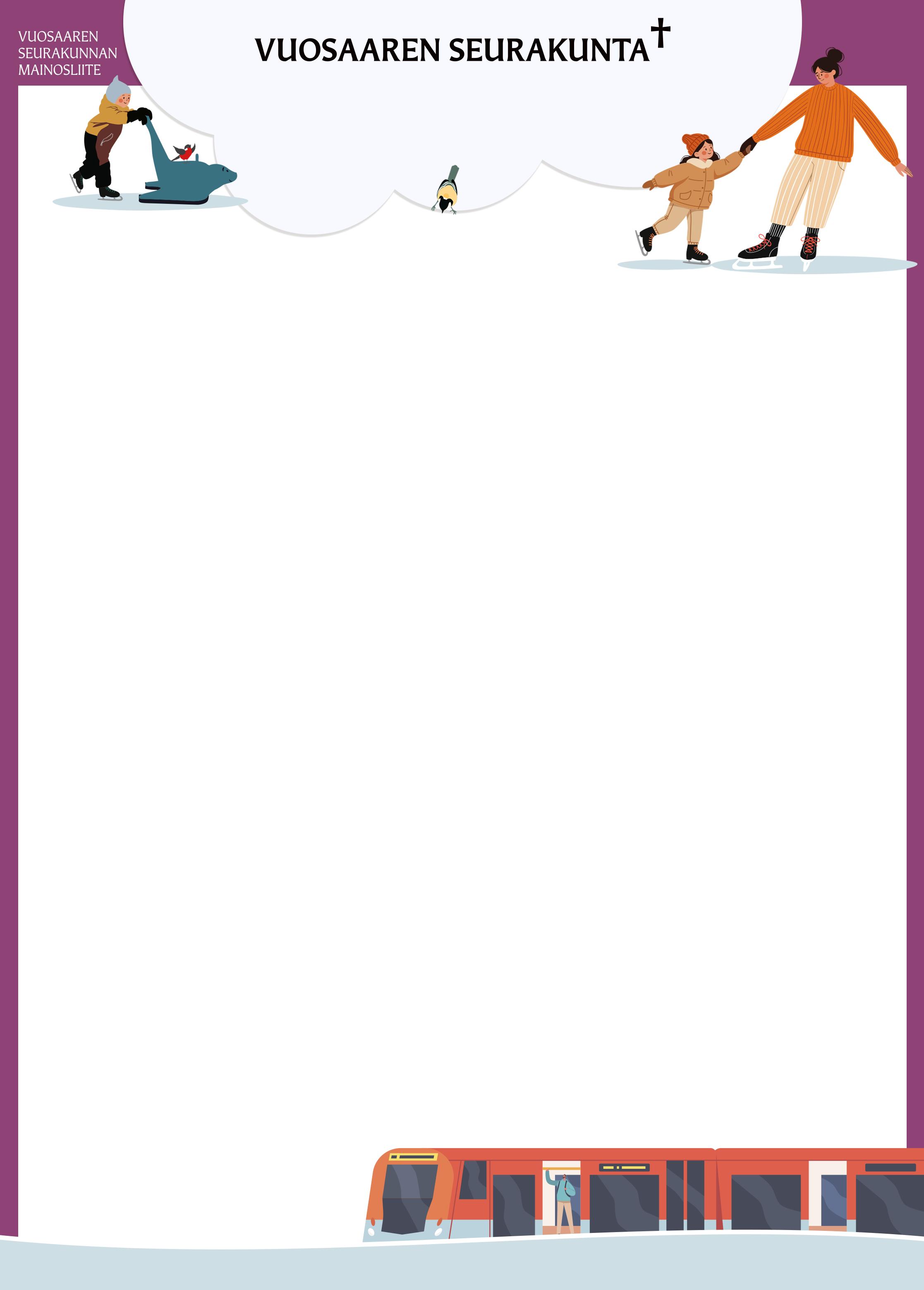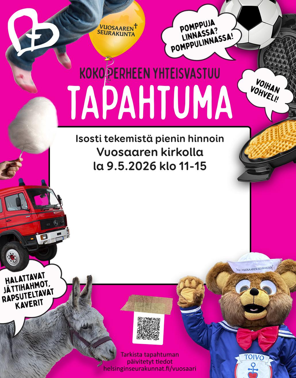AVOIN KESKUSTELU- JA RAAMATTUPIIRI kirkolla to klo 18. MIESTENPIIRI kirkolla ti klo 18. YHTEINEN LOUNAS kirkolla to klo 11. KÄVELYSEURAA VUOSAARESSA, lähtö Mosaiikkitorilta Columbuksen sisäänkäynnin vierestä ti klo 10. Reitit ja vauhti vaihtelevat toiveiden ja sään mukaan, matkasta voi jättäytyä myös kesken pois. KIRJAPIIRI kirkolla ke 28.1. klo 17.30. Ilm. 09 2340 6541, eija.keinanen@evl.fi. NEULEPIIRI kirkolla ke klo 18. ASAHI-TERVEYSLIIKUNTAA liikuntapassilla Valossa ma klo 14. TUOLIJUMPPAA liikuntapassilla kirkolla ti klo 11.30. IKÄIHMISTEN LIIKUNTAVARTTI kirkolla to klo 10.30. RUKOUSPIIRI Katukappelissa tiistaisin klo 13 ja 16. ILTARUSKOPIIRI Katukappelissa ma klo 13. KATUKAPPELIPÄIVYSTYS vapaaehtoisvoimin ti 12–16. LASTEN JA VANHEMPIEN ARKIRETRIITTI Katukappelissa ke 28.1. klo 15–16. Ilm. mia. tervonen@evl.fi. PERHEKERHO Valossa ti klo 9.30–11.30. JUNNUKAHVILA Valossa ma klo 15–18. NUORTENKAHVILA Valossa ti klo 16–21. VALON ILTA nuorille to 22.1. klo 17–21. ISOSKOULUTUS Valossa ti 27.1. klo 17. DIAKONIAN AJANVARAUS 050 499 4635 / 09 2340 6518 ma, ti, to klo 12–13. Jätä soittopyyntö: vuosaari. diakonia@evl.fi. Sähköinen ajanvaraus: asiointi.helsinginseurakunnat.fi. Käyntiajanvaraus Valossa ti 12–13.